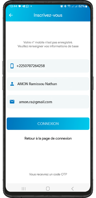 A partir de l'écran de connexion, entrez votre numéro de mobile enregistré et vous recevrez un code d’authentification (OTP) par sms. Vous pourrez vous connectez avec succès en entrant le code d'authentification.